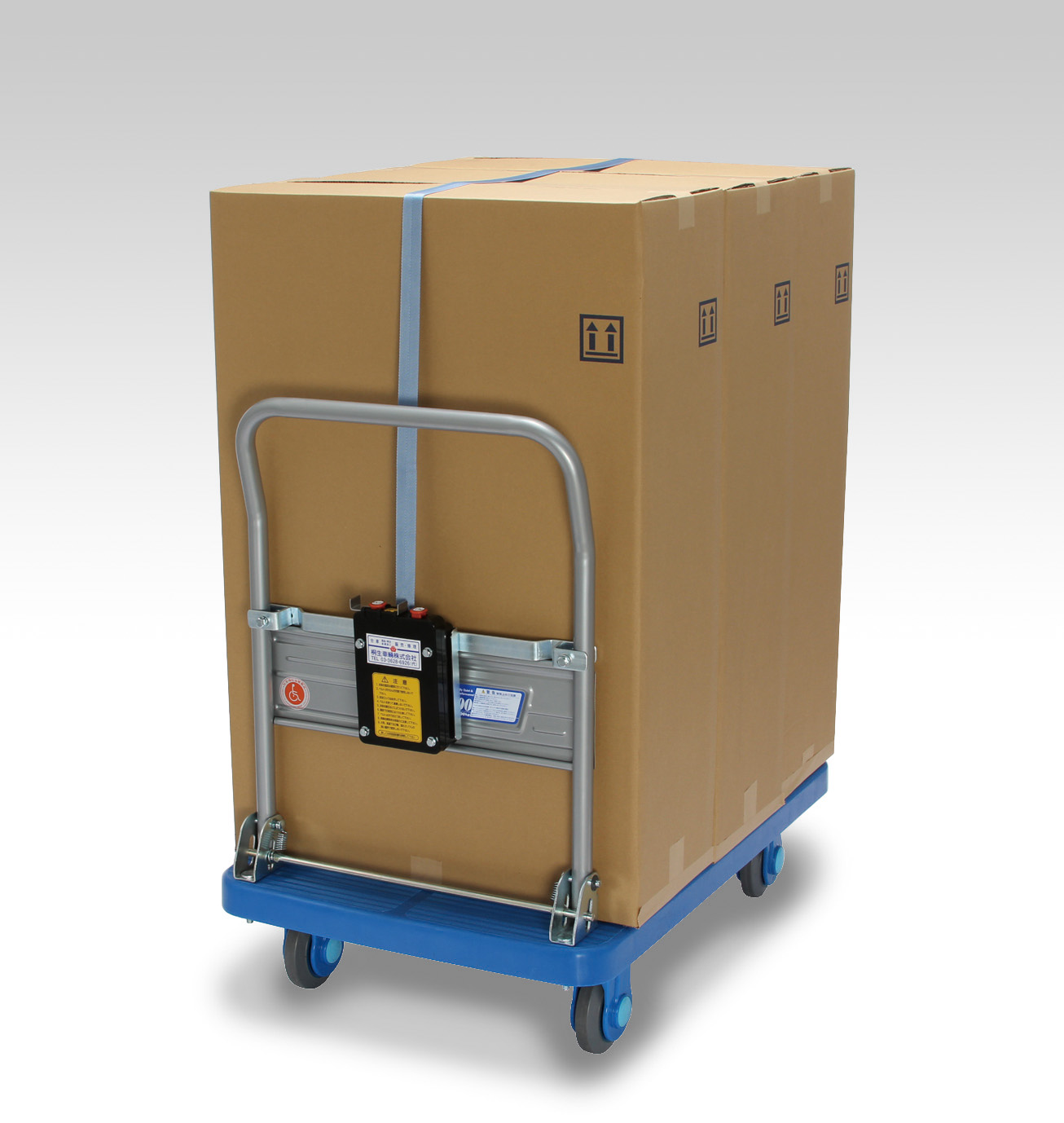 荷締機付台車 前面フック 特徴 荷締機付台車は、積荷の高積みや不安定な形状の積荷、それに輸送路面の段差や悪路での荷崩れ防止に役立ちます。 仕様 最大積載質量 200kg 適応機種 PLA300・PLA300-DX